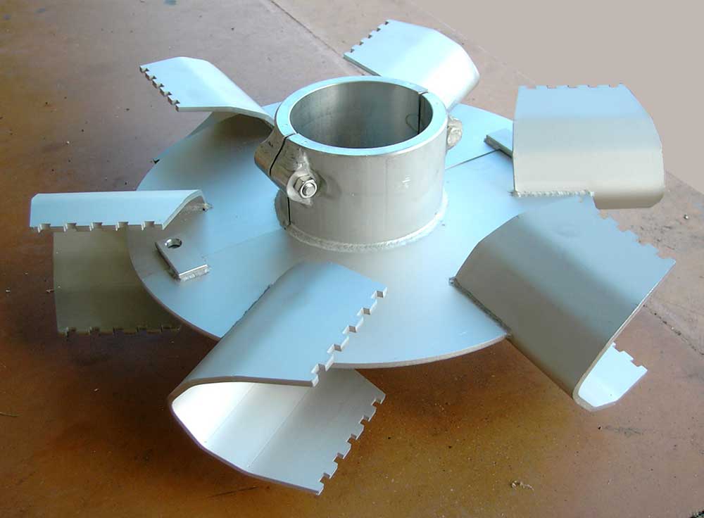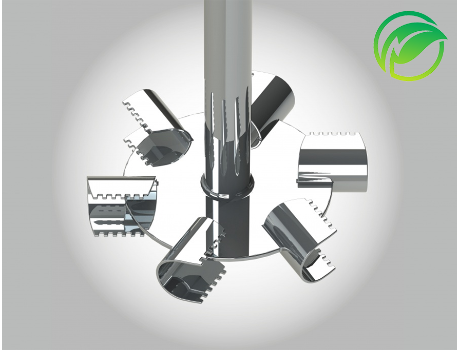 L’évolution dans le design des pales sur le nouveau mobile DisGaz consiste en l’ajout de peignes en bout des aubes. Le gaz est griffé lorsqu’il traverse les peignes. Avec un liquide ainsi cisaillé, la dispersion du gaz augmente de la surface d’échange gaz/liquide. La formation de microbulles de gaz est, par ce procédé, également largement favorisé. L’échange gaz/liquide est devenu avec cet agitateur novateur aussi performant qu’avec une turbine Rushton avec une réduction sensible : environ 30 % de la réduction de la consommation d’énergie.
